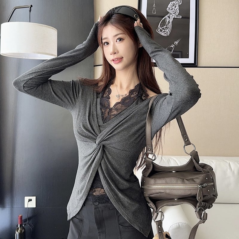 【蕾絲V領掛脖式長袖】純欲風穿搭圖鑒!舒適面料,柔軟親膚,大扭結V領假兩件設計,顯現天鵝頸穿上秒變纖細小蠻腰!